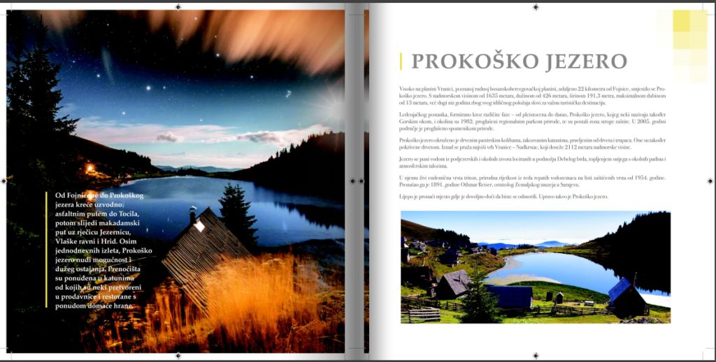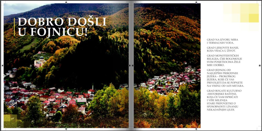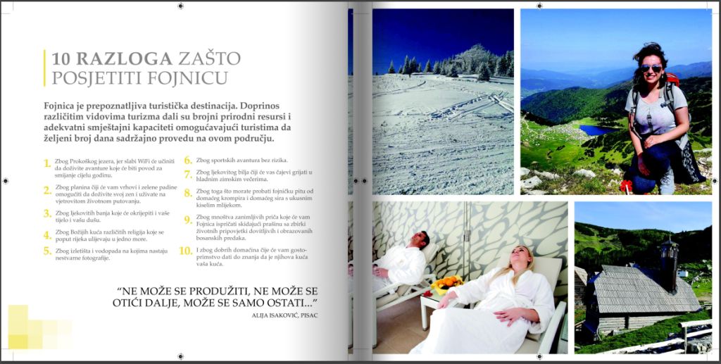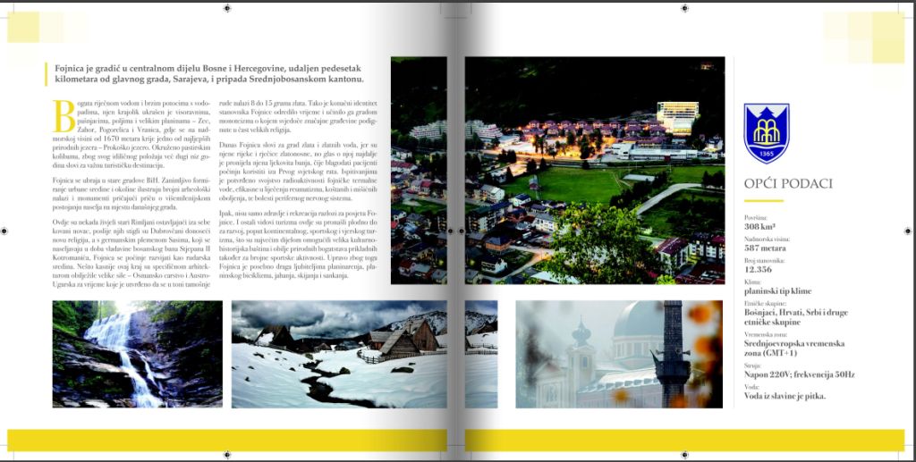 Brošura obiluje predivnim fotografijama te upečatljivim tekstovima koji vrlo živopisno oslikavaju turističike destinacije i ponudu Fojnice.