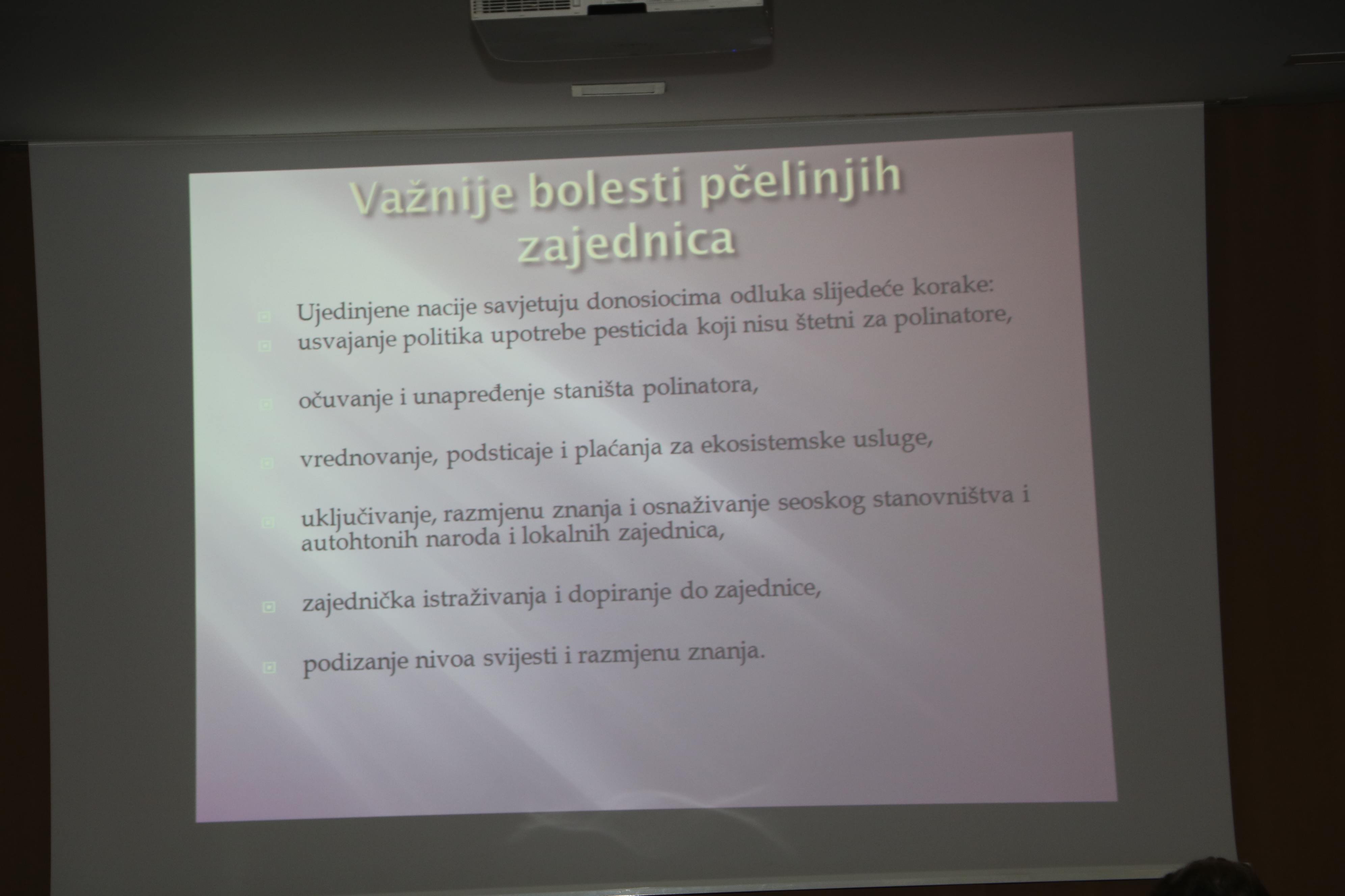 Između ostalog profesorica je govorila općenito o pčelama, kao najvažnijim bićima na planeti Zemlji. Bilo je riječi o jednoj od zaraznih i aktuelnih bolesti medonosnih pčela američkoj gnjiloći, koja može u vanjskoj sredini živjeti 40 – 70 godina.